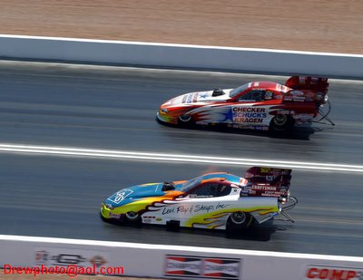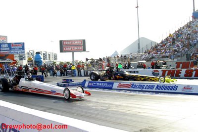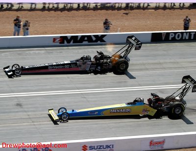 | Two rookie Top Fuel pilots in action: Ben Marshall was pulling away from Fast Jack Beckman until something broke on Ben's dragster. |