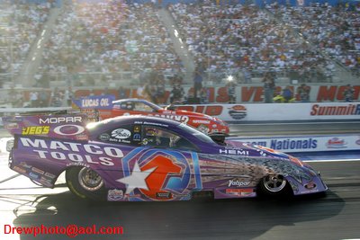| Whit in the Matco Tools Mopar Dodge got by Tony Bartone in Jim Dunn's CSKX/Lucas Oil Monte Carlo. |