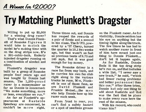Plunkett and Meinel raced their first dragster from 1962-65 and raced together until 1976. The driver was Donnie Eugene Plunkett, born in 1943. The team of Plunkett and Meinel was based out of Roanoke, Virginia. Partner and crew chief was Frank Eugene Meinel, out of Vinton, Virginia.