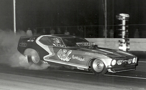 Current alcohol funny car racer Jeff Burnett ended his fuel funny car career in this Mustang II. The "ABC Special" was built to replace Burnett’s overweight Charger. Jeff used the 392 Chrysler Hemi from the Charger to power the "Special." The Mustang II had a short life. After running as quick as 8.68, it was destroyed in a crash. (Photo and info provided by David Cook)