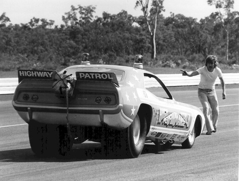 Jack McLeod was the hired gun for Graeme Cowin in the mid-seventies. Cowin had stepped out the driver’s seat after driving the Cowin & Johns Mustang. Cowin used the time off to build his High Performance World auto parts business. The High Performance World "Highway Patrol" Cuda was capable of low sevens. A new Camaro replaced the Cuda, but McLeod flipped it. This accident prompted Cowin to return to driving. (Photo and info provided by David Cook)