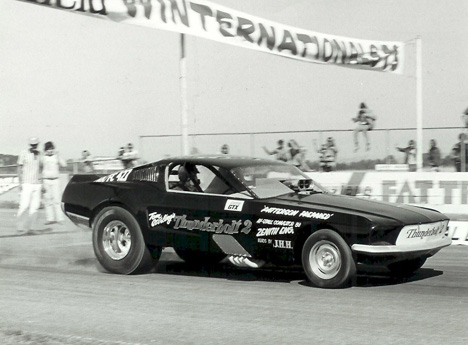 Tom Sterling’s "Thunderbolt" was a pure Ford funny car. A real 427 Ford wedge powered the clean black funny car. The "Thunderbolt" was not as successful as Sterling would have liked. The car was too heavy plus the Ford was breakage prone. A new Mustang was built and Owen Griffith took over the driving. (Photo and info provided by David Cook)