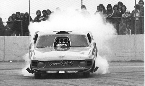 Jim Walton left the AA/FA ranks to drive this aging Mustang. Former Top Fuel racers the Hussey Bros. owned the "Canned Heat" Mustang. Jim Walton began driving this car in 1977. The low-slung car ran seven-second times. Jim Walton left the team to drive his own car again, when he purchased Gary Densham’s Monza. (Photo and info provided by David Cook)