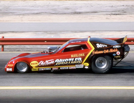 Frank Hawley came out of nowhere it seemed in 1982 to runner-up at the Winternationals with the Chi-Town Hustler. Hawley took the Omni/Charger under the existing national record. The 'Hustler had been a star on the match race circuit for years, usually shunning national events. By 1982, Farkonas, Coil, & Minick knew the match race circuit was drying up and decided to run some national events. Showing that Pomona was not a fluke, the team won at Gainesville in their next race. The team parlayed the good start to the NHRA World Championship in 1982 plus won the Big Bud Shootout at Indy. They repeated in 1983 with four national event wins plus the Super Stock and PHR Nationals titles. The Chi-Town Hustler ran 5.70 at 249.30 in 1983 according to DRL files. Until he got the Chi Town ride, Hawley was known only in the Midwest as a good alcohol racer. His driving ability and Coil’s tuning were second to none. Hawley went on to open the Drag Racing School and Coil went on to tune for some guy named Force. (Photo provided by Mike Ditty; info from DRL files)