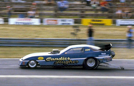 In 1983, the team of Candies & Hughes returned to the funny car wars after racing top fuel for almost ten years. By 1983, Top Fuel dragster popularity had bottomed out. New teams were not building dragsters and existing teams were leaving the dragster ranks for funny cars. Candies & Hughes had Al Swindahl build them a new Trans Am. Team driver Mark Oswald had never driven a funny car. The team DNQ’d at Pomona but after that, they hit their stride. They won a couple of races with the car in 1983 and 84 (three wins and three runner up finishes). In 1984, they added sponsorship from Old Milwaukee Beer. The red Candies & Hughes car won the 1984 NHRA Championship. Oswald drove the Leonard Hughes tuned car to a 5.62, 262.69 best. This car is currently in the NHRA Museum in Pomona. (Photo courtesy from James Morgan and www.motorsportsunderground.com; info from DRL files)