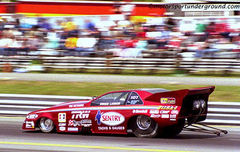 Bruce Larson was the last little guy to win the NHRA Championship in AA/FC. Larson had been known as a good match racer with his “USA-1” cars. By the late 1980s, a person could not make a living match racing. This forced Bruce to race the NHRA circuit. In 1989, Larson built a new Oldsmobile Cutlass with moderate backing from Sentry Tachs & Gauges. The Oldsmobile was a departure for Bruce Larson. It was his first non-Chevy since the early 60s. The crew, led by the late Maynard Yingst, also received tuning help from Joe Amato crew chief Tim Richards. Larson’s team won six races and runnered-up in five more. That enabled them to win the NHRA championship. Larson finally ran 5.13 at 281.45 in the Cutlass, which now resides in the Smithsonian Museum of American History in Washington, D.C. However, pictured is the team's Chevy Beretta, which, believe it or not, was originally Joe Amato's Ford Mustang! (Photo from James Morgan and www.motorsportsunderground.com; info from DRL files)