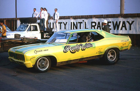 Nobody that can argue that Randy Walls is not a true blue Chevy racer. This Nova was his third funny car and his first fliptop. Bob Thomas built it to replace a crashed Corvair. The Nova ran a Chevy on 60 percent nitro with an automatic transmission. Randy took the yellow Nova on national tour and ran times in the 7.50 range. Walls returned in the new millennium to race a vintage Chevy powered Nova on the Goodguys circuit. In fact, he was the 2004 series champion and the first to be crowned. Randy is said to have built an all new Nova and it's almost ready to race. (Photo courtesy of Mike Ditty: info from Draglist.com files)