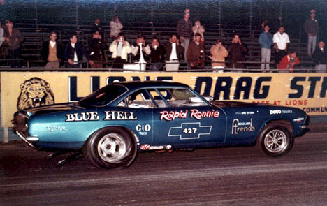 Ronnie Runyan was a die-hard Chevy funny car racer. Runyan began his funny car career with a gasser style ‘63 Corvette in Southern California. Ronnie kept updating the Corvette until it was time for a new car. He had Dick Fletcher build the "Blue Hell" Corvair, which was much lighter than his stock based Corvette. Runyan raced on the West Coast and in match races, running both cars at some races! Success on the match race scene enabled Ronnie to move to Missouri. The move allowed him to be closer to more races and more money. The "Blue Hell" Corvair proved to be his best-known race car. It ran 7.83 at 187 before being replaced. (Leonard Maxwell photo courtesy of Bob Plumer and Drag Race Memories; info from Draglist.com files)