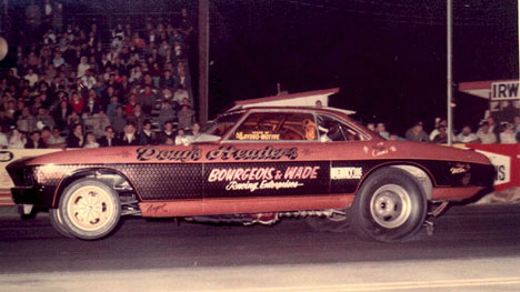 Doug Thorley had a charmed racing season in 1967. A 7.69 elapsed time and a win at Indy set the wheels in motion for the 1968 season. Thorley sold the winning Corvair to Joe Pisano, then built two funny cars in 1968. One was a rear engine Javelin sponsored by American Motors. Doug also built a new Corvair that was lighter than the original steel bodied Chevy. Thorley concentrated on his growing header business and the Javelin, and Dick Bourgeois and Earl Wade took the new Corvair on tour. Dick Bourgeois had raced blown gassers before getting into the funny car wars. Earl Wade was the legendary tuner for Don Nicholson. Bourgeois & Wade did not have the same success with the Corvair in 1968 that Thorley did in 1967. The team did okay in match races across the country. The team came back to California and took over Thorley’s AMC sponsorship, replacing the Corvair body with a Javelin. (Leonard Maxwell photo courtesy of Bob Plumer and Drag Race Memories; info from Draglist.com files)