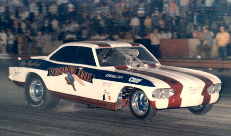 Jim Maybeck entered the funny car scene in 1967. Maybeck purchased Bruce Larson’s all-fiberglass "USA-1" Chevelle and renamed it the "Patriot.” In 1968, Jim built an all-new Corvair funny car built to replace the outdated Chevelle. Maybeck kept Chevy power in the new funny car, and named it the "Screaming Eagle," keeping the patriotic theme. The "Screaming Eagle" was a regular in AHRA events and match races, achieving moderate success. Jim may have had the quickest Corvair with a 7.32, 194 clocking to his credit. (Leonard Maxwell photo courtesy of Bob Plumer and Drag Race Memories; info from Draglist.com files)