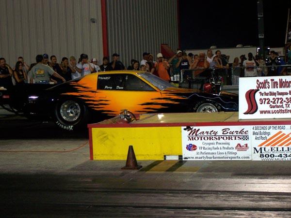 Perry Dunn and Heath Harvey were out testing their Pro Mods Saturday night at Caddo Mills. Dunn got in one run. After a killer burnout, he drove the Thunder Chicken to a super 4.20 at 171. The run was not without damage as parts breakage lead to a small cleanup of oil on the track. The breakage was enough to end Perry's night.
