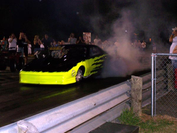 The race of the night was next. Doug Riesterer ran an outstanding, awe-inspiring 4.05, 180.81 to drive around Booby Booth’s 4.18 at 173.71. The crowd went wild over the race between the night’s fastest cars. Riesterer had smoke trailing the car in the shut down area. Thankfully, the oil left by the Camaro was only blow-by.