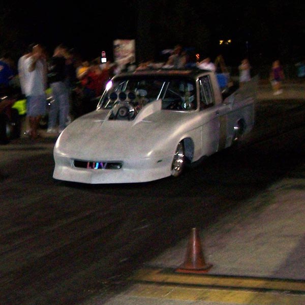 The first round of qualifying began the battle of the two Chucks with Chuck Poindexter’s Luv taking on Chuck Nuytten’s nitrous Corvette. The wind was blowing hard and as clouds rolled in, the racers staged. Nuytten spun off the line and got crossed up to run a 5.23 at 145.32, while Poindexter motored by with a 4.88, 144.18 pass.