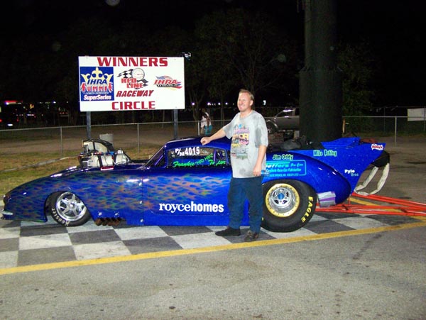 This was Doug Riesterer’s first ever TOPMA win and he ran the quickest nitrous run in TOPMA history with a 4.05. The win was a great vindication for Doug because it came at the place where he had two accidents with his previous car. Riesterer thanked his crew Eric Curtiss and Mike Willis, and also mentioned thanks to his sponsors, Santruff Struts and Chuck Fisher Auto Sales in Victoria, Texas.