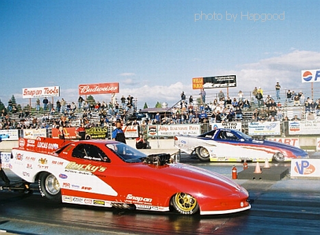 In what might have been the most closely watched TAFC funny car matchup at Woodburn dragstrip in many years, Brian Hough and Bucky Austin did their burnouts and pulled to the line. Hough left first (.075 to .116) and a couple seconds later it was all over. Austin's car skated and shook while Hough went on to record the best TAFC numbers of the weekend, a 5.730/251.67. The crowd went nuts.