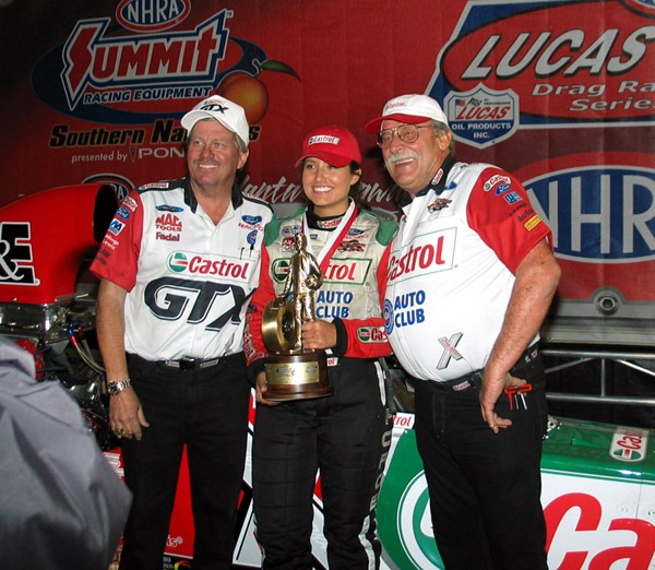 | L-R John Force, top alcohol winner Ashley Force, and car owner/crew chief Jerry Darien. |