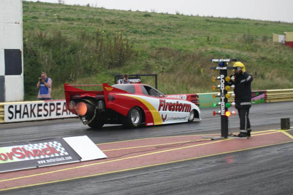 The pictures show the Firestorm jet-powered funny car being driven by Roger Goring at the National Street Rod Association's Hot Rod Drags meeting held at Shakespeare County Raceway on 16 September 2006. Firestorm is currently running low 6 second ETs at over 250 mph. Note the fireman having to support the Christmas tree. Better him than me!