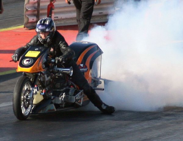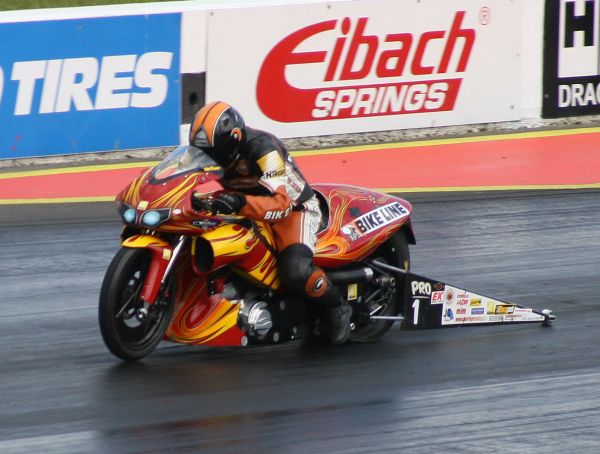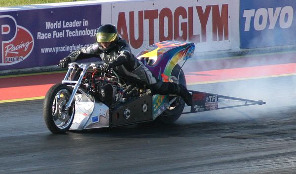 Final of this first round saw Anita Makela off the line ahead of Stig Neergaard with Stig on and off the pedal to such an extent that Anita thought again after slowing from tyre shake and got to the finish line just ahead of Stig despite the resultant Fire from her engine in 7.803 sec / 109 mph to 7.868 sec / 105 mph.