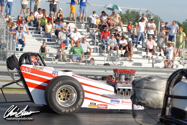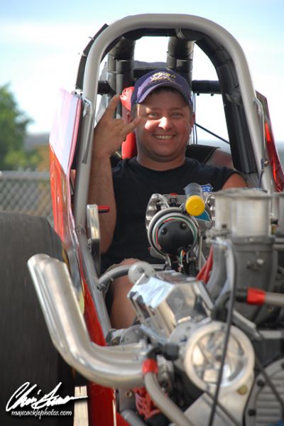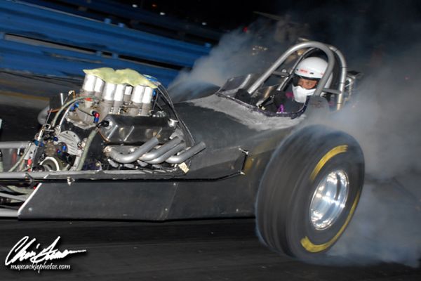 Ricky Marshall debuted his new ride for 2009, a true show piece that goes as fast as it looks, and took the top spot after the first session of qualifying with a 4.80 at 141 mph. Keith Breazeal was right behind with a 4.82 at 142 mph with Mike Millsap, Scarlata and Grindstaff all clocking times in the four nineties. Richard Brady and Scarlata provided the most entertaining pair of the session as they did their impressions of two out of control fuel altereds! Brady started out hugging the centerline at halftrack and steered it back as Scarlata then got out of shape and also headed for the centerline and they were both out of shape as they tripped the clocks. Scarlata legged it through to a 4.94 at 138 mph while Brady clicked it early to a 5.20 at 99 mph.