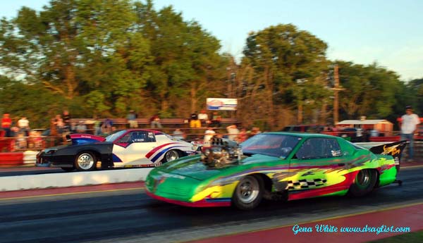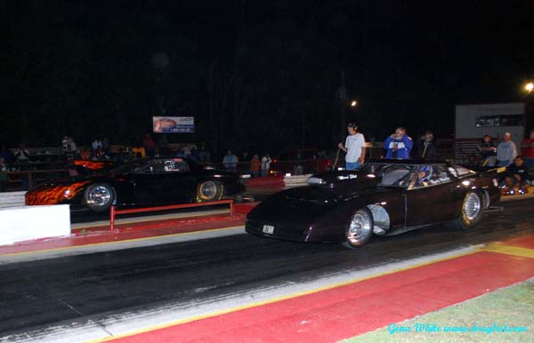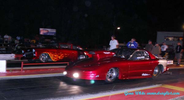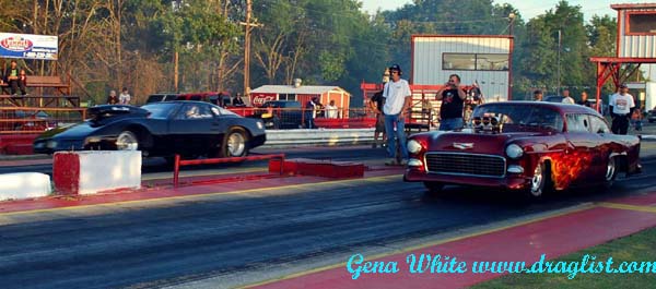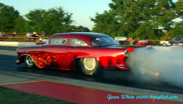 Randy Reschner tested at the Paris Drag Strip the week before and it paid off with his best ever run of 4.81 145.75 in his Money Shot Corvette. David Smith suffered severe tire shake in the family's 55 Chevy on the way to a shut off run of 6.41 81.55. The final pair in the first round of qualifying was Jerry Cain and H.T. Wilson in a battle of blown versus nitrous cars. Wilson got there first to take the fourth spot with a 4.91 135.72 while Cain had problems on the way to a 5.45 140.77 run that landed him in the number five spot.