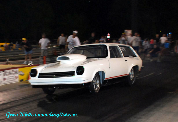 The next pair was two Vegas, yes two Vegas! Dewayne Pebworth in his wild Vega Station Wagon facing Kent Birkes in the Clark Bros. Paint and Body blown small block Chevy Vega. The pair left together but Pebworth had some handling problems with the Vega shutting off to a 6.71 69.56, Birkes meanwhile ran hard to mid track then the Vega laid over running a 5.30 131.60.