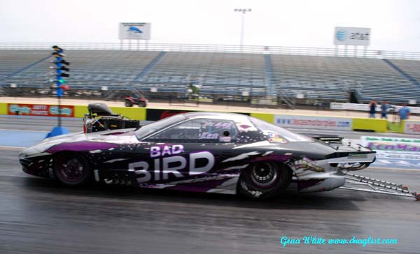 Randall Reid debuted the new Predator Studebaker from Wichita Falls, Texas against Wes Johnston. Johnston got there first with a 4.10 at a whopping 195 MPH, while Reid struggled to a 5.70. Jackie Deaver made his 2008 debut running a 5.05, Eric Clark goes down the track with a 4.52. Wes Johnston runs a good 4.101 195.36. Ken Thomas and the Bad Bird Firebird faced off with OTS racer Ed Roach, Thomas had a problem staging and both cars were backed off the starting line.