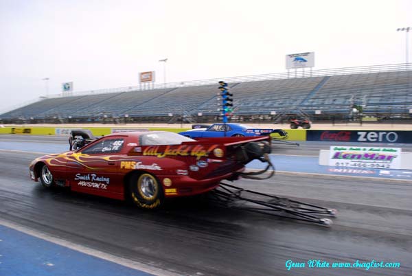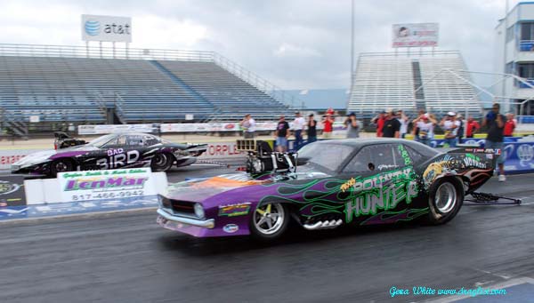 Swindoll was testing Mike Edwards ex GTO with backing from Medina River Resort Ranch while racing TOPMA also. Frankie Taylor and Swindoll both cars suffered severe shake. Wes Johnston cannot fire, Chris Smith ran straight and true on a 4.20. Jackie Deaver broke, Riesterer ran a 4.03 in the heat of the day. Gaylen Smith went to the third spot with a good 4.04 run to end the round.