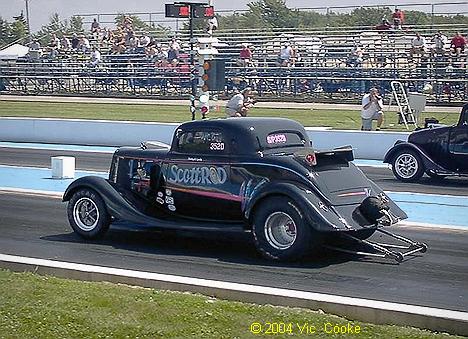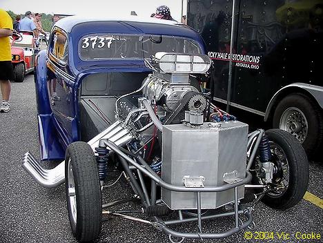 | Micky Hale has retired the old "Voodoo" Gasser and brought his brand new '37 Chevy replacement car to Thompson, seen here in the pits. |