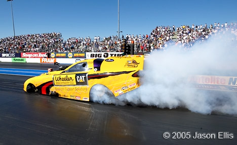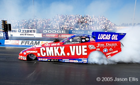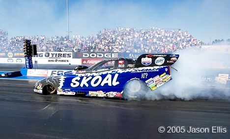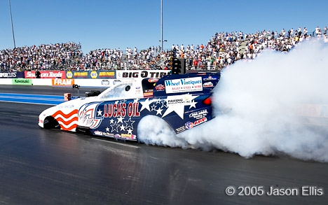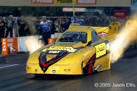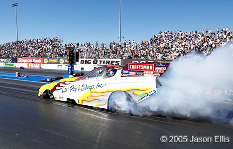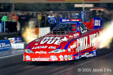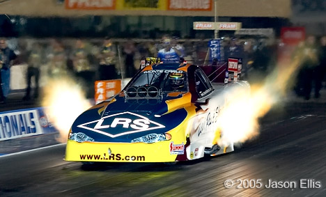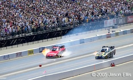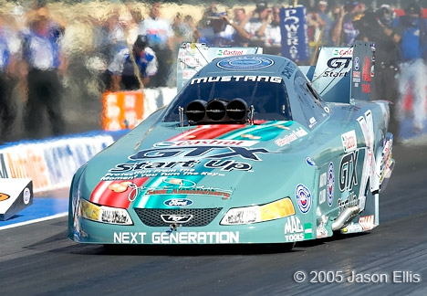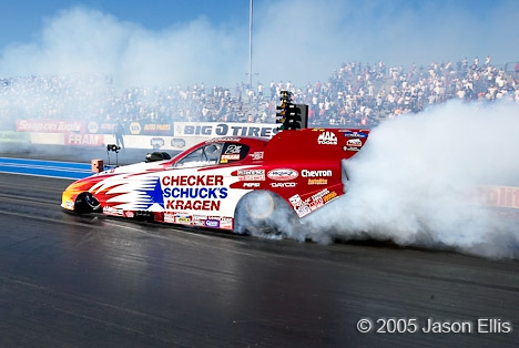 | John Force was taken out in round one of eliminations by Ron Capps. |