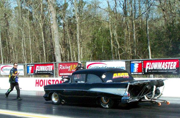 In ADRL Extreme 10.5, almost anything goes as long at it happens on 10.5 inch slicks! The 57 Chevy is driven by Chad Wilson, a crew member on the team's Pro Mod car. Chad has had trouble hooking up the big 57 on the tiny tires, but has run a best of 4.76 in testing. The team went out in the first round at Houston but was very popular with the fans.