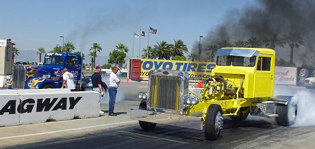 | A pair of Semis doing burnouts. You don't see THIS at the Ontario truck stop! |