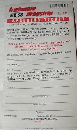 Now both cities have a place to help battle illegal street racing. While talking to a couple of Irwindale police officers, they laid out a new tactic to use during encounters with guys or gals in fixed up cars. The cops would pull them over, talk to them about the dangers of street racing, and then pass out an Irwindale Speedway “ticket” that looks just like a real speeding ticket. This ticket, however, gets you one free trip to run your car or motorcycle at the strip. Damn, how come when I get pulled over all that I have ever gotten was a speeding ticket?