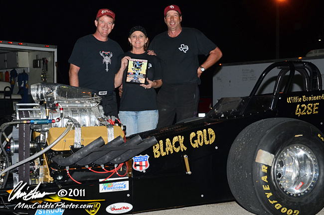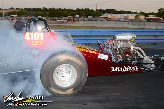The Texas Blown Fuel Association had a very successful second outing of the season and the series would like to thank Good Vibrations, JamWorks Chassis and Competition Sales of Dallas for their support in the 2011 season. Chris Stouffer took home the $50 "#1 Qualifier Bonus" from JamWorks Chassis and free case of Brad-Penn Oil from Competition Sales of Dallas, Leonard Ament took home the $100 bonus from Good Vibrations "Quick Reaction Time" bonus and the MaxCacklePhotos.com "Best Burnout" bonus as well.