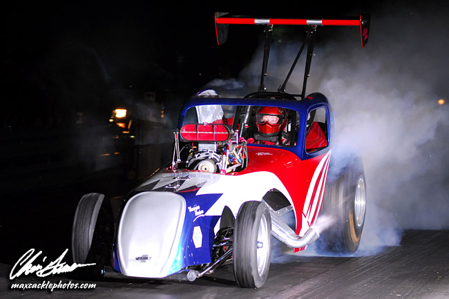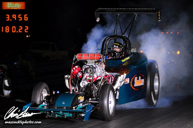 The OFAA points leaders rolled out next as Nick Poloson and David Purifoy laid down side by side burnouts. Poloson had been out the night before doing some testing and ran into serious transmission issues. Bright and early Saturday morning, car owner Tom Wood and Poloson made the drive to downtown Dallas and picked up spare parts supplied by fellow OFAA members Kenny Trumble and Donny McSwain. The "Sundown" team slapped their rebuilt B&J back in the car and could only muster a 4.46 at 165 mph in first qualifying session as Purifoy blasted to a 4.08 at 175 mph in the "Thrill Factor" machine. That left Poloson on the bump heading into the final session while Purifoy sat nicely in fifth position. Next out was the debut of the Jim West driven "Wild Wild West" full bodied 1948 Fiat with a BBC on nitro! This was West's first pass in the car as it launched hard, West gave it a quick pedal job, then drove it through to a 4.83 at 110 mph. The session closed with Mark Bowman clicking off a solid 4.12 at 170 mph in the "Blown Income" altered.