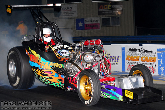 Chris Trussell was out next along side Mark Bowman. Bowman clicked off a solid 4.13 at 171 mph to secure his spot in the field while Trussell pulled away to an impressive career best 3.97 at 176 mph in the "Assassin" ride. A pair of former Division 4 Alcohol Funny Car Champions closed the final qualifying session as Todd Simpson and Jimmy Jones lined up in an old school battle. Simpson got in the show with a 4.26 at 148 mph as Jones clicked off a strong 3.97 at 163 mph in the "Texas Tremor" altered. Steve Tryon returned to NSD with the "Bad Company" altered with his nephew behind the wheel for the first time, besting an 11.69. DoDad Burton and the "Free Spirit" team fought electrical issues all night and failed to make the show, but will be back in San Antonio for the OFAA season finale on October 23rd in San Antonio. Bobby Marriott would lead the field into eliminations for the third time this season as an extremely important first round of eliminations was to follow.