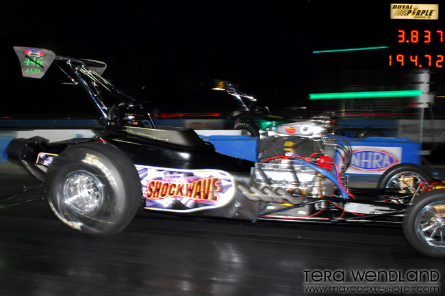 A quick re-cap of first round sees that six of the ten cars in first round clicked off career best passes and Chris Trussell became the fourteenth member to join the OFAA 3-Second Club. David Purifoy made up more ground over Nick Poloson in the points chase by winning first round and to Chris Trussell came some interesting news, as he was inserted into the final against Jimmy Jones after Marriott and team "Shockwave" discovered a nibbled piston after first round. Instead of thrashing to repair the piston and possibly delaying the show which was set to conclude at the strike of midnight, Marriott withdrew putting Trussell in as the third quickest winner of first round.