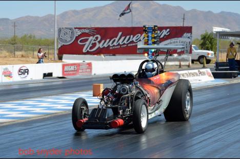 On May 18th, in conjunction with the Tucson Dragway Reunion, the Western Fuel Altereds held their first event of 2013 at Southwestern International Raceway in Tucson, AZ. Twelve teams were in attendance including the two newcomers of Mic Williams and Greg Holman. The event was run as a shootout format, two rounds of racing with the quick two ETs racing in the final.