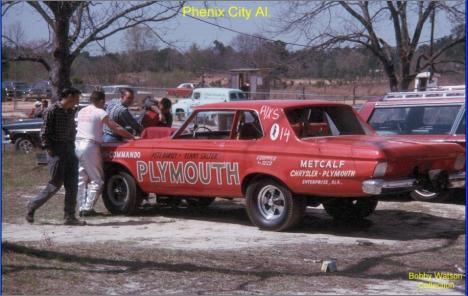 Notes: Injected fuel AWB. Ran car, as in this photo, in 1965 and early 1966. Second entry is same car with different paint in 1966. They then ran an acid-dipped Barracuda early-mid 1966, before selling that. Phenix (Ala.) Dragway, 4/66 - DD | Unattributed 9.46 ET. |
