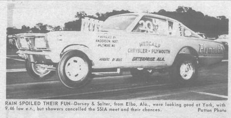 Notes: Injected fuel AWB. Same as Dorsey car in other 1966 entry, just different paint. Ran car in 1965 too. Early-mid 1966, replaced this with Barracuda, which they sold before the end of 1966. Warner Robins GA 1966 (4/29/66 National Dragster) |