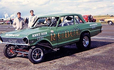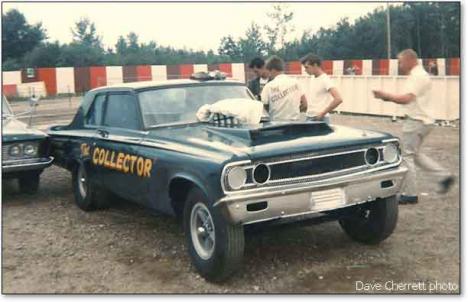Notes: Injected fuel-113.5" AWB (fronts hiked 20" and rears a foot), tube axle with transverse spring. weighed 2200 pounds. Acid-dipped steel shell with fiberglass front end and aluminum hood. Late-hemi, Hilborn, TorqueFlite combo built for NHRA A/XS class. Car replaced previous AWB 1965 Plymouth. Car was sold to Bly & Walker later in 1966. They ran the car through 1967. Dorsey set the national A/XS record in May 1966. Featured in 10-66 Drag Strip. - RT |