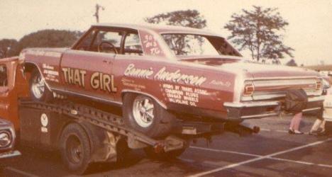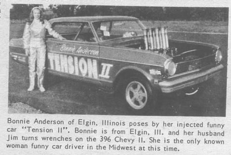 Notes: Bonnie Anderson moved to this AWB Chevelle for the '67 season, after her "Tension II" Chevy II was destroyed on the Union Grove, Wis. return road by an errant fuel dragster in Fall 1966. - RT | Alton Dragway advertised her racing a 67 Chevy Malibu. - Danny White |