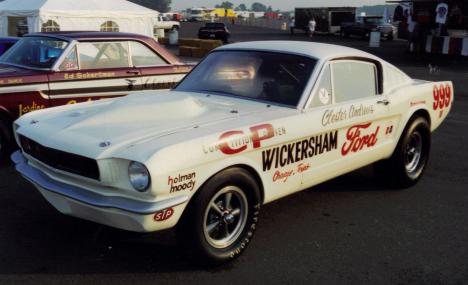Notes: The late Clester Andrews was one of Texas' most successful racers in the first half of the 1960s. Clester's success had come in Stock, Super Stock, and A/FX. In the A/FX wars, he won 40 of 42 match races in his Holman-Moody built 1965 Mustang (according to the Holman-Moody website). That car morphed into his first match bash funny car. In 1967, Andrews replaced the old 1965 Mustang with a new match bash Mustang. Holman-Moody built this new Mustang as well. Ford supplied the rare and powerful injected SOHC that Jack Quinn tuned. Clester got sponsorship from Bardahl and hit the major national events with the car. Andrews raced many match races with the Bardahl 555 Mustang. | Note: This photo shows the earlier '65-'66 Mustang, not a '67. - RT |