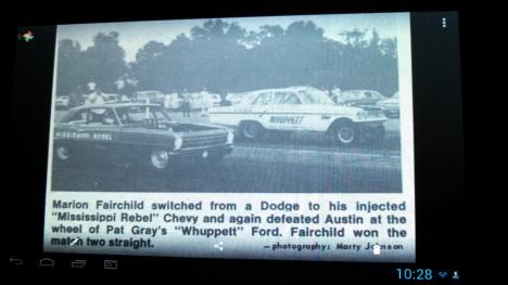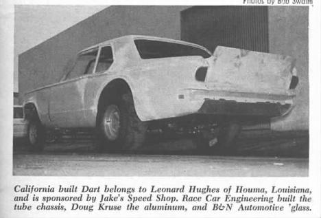 Notes: Leonard faced Larry Reyes at LaPlace for a best of five match early in the year. Unfortunately, he lost three straight to the "Kingfish" with a 9.39 best compared to Reyes' 8.97 best. Hughes was at Biloxi on June 4 for a best-of-three-match race with "Dyno Don" Nicholson. During this period, the fiberglass, SOHC-powered Comets were pretty much unbeatable, and Hughes lost three straight. Injected fuel, AWB built by Leonard Hughes. Leonard ran the car in 1965. By the end of 1966, a new Dart was under construction. Memphis 1966 (7/01/66 Drag News). |