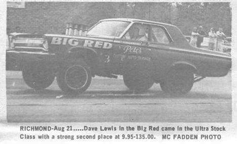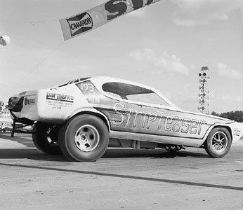 Notes: This was one of the four 2% cars constructed for the 1965 Winternationals in Pomona. Owned by Dick Branstner, his shop converted it to full AWB right after that event. Lindamood drove it in the spring with good publicity, but it was the first to lose factory backing after doing wheelstands and playing with fuel after factory coordinator Dale Reeker's telegram banning those activities. Branstner sold it to "Mr. Norm" Kraus, who ran it first as an injected car with Jim O'Connor driving, then swapped in his supercharged combination, which Gary Dyer drove to an 8.63 at Lions in October. Ran through part of the 1966 season. Disposition is unknown - DD | On April 11, Roger faced off against Hubert Platt in a best of five match race at Aquasco. Hubert won the first two races with a holeshot 10.85/125 in the first race that beat Roger's quicker 10.62/131.00, and a 10.71/124 won the second race when Lindamood fouled away a 10.58/131. Then Roger won the third race with a 10.52/132. Platt's Falcon broke two valve springs in the fourth race and slowed to an 11.77 that lost to the Dodge's 10.60/131. Lindamood soloed in the final race to win the match, but he pulled a huge wheelstand that broke his oil pan when it landed. On June 5, Lindamood was in Detroit, where he faced off against Mike Buckel, who was driving the "Ramchargers" car. It was to be a best of five match. Mike's 10.32 won in the first race when Lindamood went into a wheelstand and shut down. In the second race, Roger's 10.26/138.50 got the win. But Buckel came back to win the next two races and the match with a 10.04 best. |