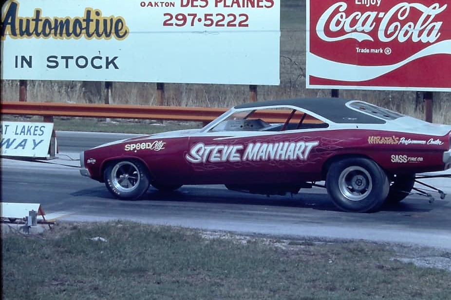 Notes: Photo from Minnesota Dragways, summer 1970. Steve Manhart and Dick Engel bought Al Fontanini's old car and started running some big numbers on the UDRA Circuit. The 426 Hemi was built by Weimer Machine and Steve drove it to 7.83/184.26. Also ran 8.34/169.81 at Minnesota Dragways 7/70. |