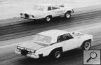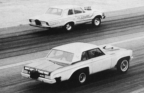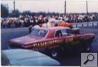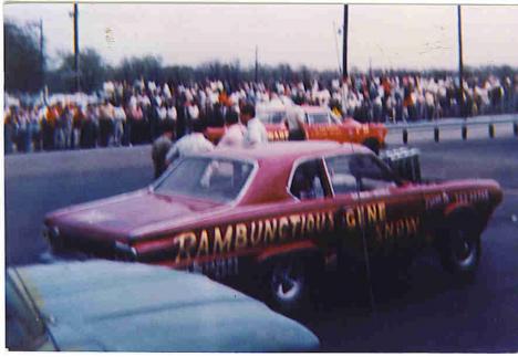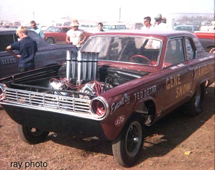 Notes: Gene Snow's "Rambunctious" 1965 Dart is one the greatest race cars of all time. Snow won two US Nationals in a row with the car in 1966 and 1967. The Dart was built from a stock Dodge. Over the course of a couple of years, T-Bar Chassis jcompletely rebuilt the car. The Dart was steel, save for the fiberglass front end. All unneeded weight was cut off and the interior was replaced with aluminum. The Dart had windows to begin with, but they were taken out later. When T-Bar rebuilt the car, they also lengthened the chassis. The Dart was a good racer before the rebuild and was great afterward. Snow won the two races at Indy and countless match races all over the country. The Dart was well known for leaving with the wheels up, but going straight. Gene won Indy 1966 running C/Fuel Dragster with a 9.04. Set both ends of the C/FD record at Austin TX in July 66 at 9.33/153.58. |