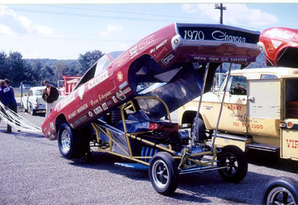 Notes: Injected Cammer, C-6 combo. All-glass body, but not a flopper. had a removable hood for servicing the engine. Car was featured in March '68 Super Stock & FX magazine. Sontag was a longtime Chevy man who jumped to a Ford-powered funny. He was a familiar face on the Upper Midwest funny car scene at the time. - RT (Photo from 1969.) |