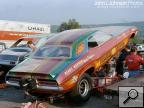 Notes: Bill was at Cordova on July 29 for the UDRA Circuit race. His 9.47/154 beat Larry Swiatek's GTO in the first round at 10.07/142. In the semifinal, he faced Al Fontanini. Al got the jump but was surprised to see Bill starting to drive around him. He began to close the gap when he pulled third gear, but it was too late as Sontag's 9.20/154 beat the 'Cuda's 9.51/157. He then had to race Henny Hallman's 'Cuda for the money. Unfortunately, Bill had to lift in the final, and his 10.12 finished runner-up to Hallman's 9.41. Photo from 1969. | Injected Cammer, C-6 combo. All-glass body, but not a flopper. had a removable hood for servicing the Cammer. Car was featured in March '68 Super Stock & FX magazine. Sontag was a longtime Chevy man who jumped to a Ford-powered funny. He was a familiar face on the Upper Midwest funny car scene at the time. - RT |