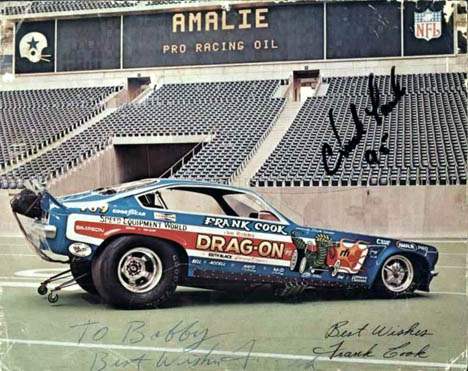 Notes: We need to confirm that the 7.68/167 was run in 1970 and not 1971. Qualified third at NHRA Ontario 11/21/70 Comp Eliminator field at 8.061. Held A/FC record in 1970. |