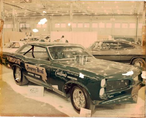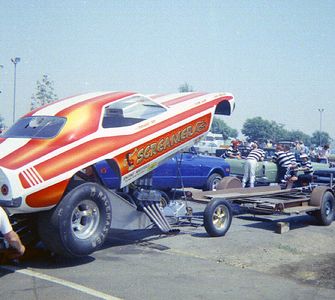 Notes: Pete Fullerton and Gary Benedict owned the car from 1972/1975. It had the original BB Chevy L-88 Hi-perf block bored to 440, Enderle injection, TH-400, and was running in A/FA. It wore Tempest badges and taillights, not GTO. Logghe chassis with full fiberglass body, and lift off front, it was beautifully built and detailed by Tom Dempsey. The body was originally built for Arnie Beswick by Fiberglass Ltd, but he did not like that it was a Tempest (vs. GTO) and did not like the blue windows, so the body was sold to Dempsey for this car's build. The car weighed 1620 pounds wet. We ran it for time and exhibition runs at Great Lakes Dragstrip in Union Grove WI a few times before we sold it. We raced with 30-40% nitro purchased from Don Schumacher (thanks Don!) We have additional pictures if interested. The car was sold in early 1975 to a group in Chicago. Shortly after the sale, one of the new owners destroyed the car in a street racing incident. Unfortunately the car no longer exists. |